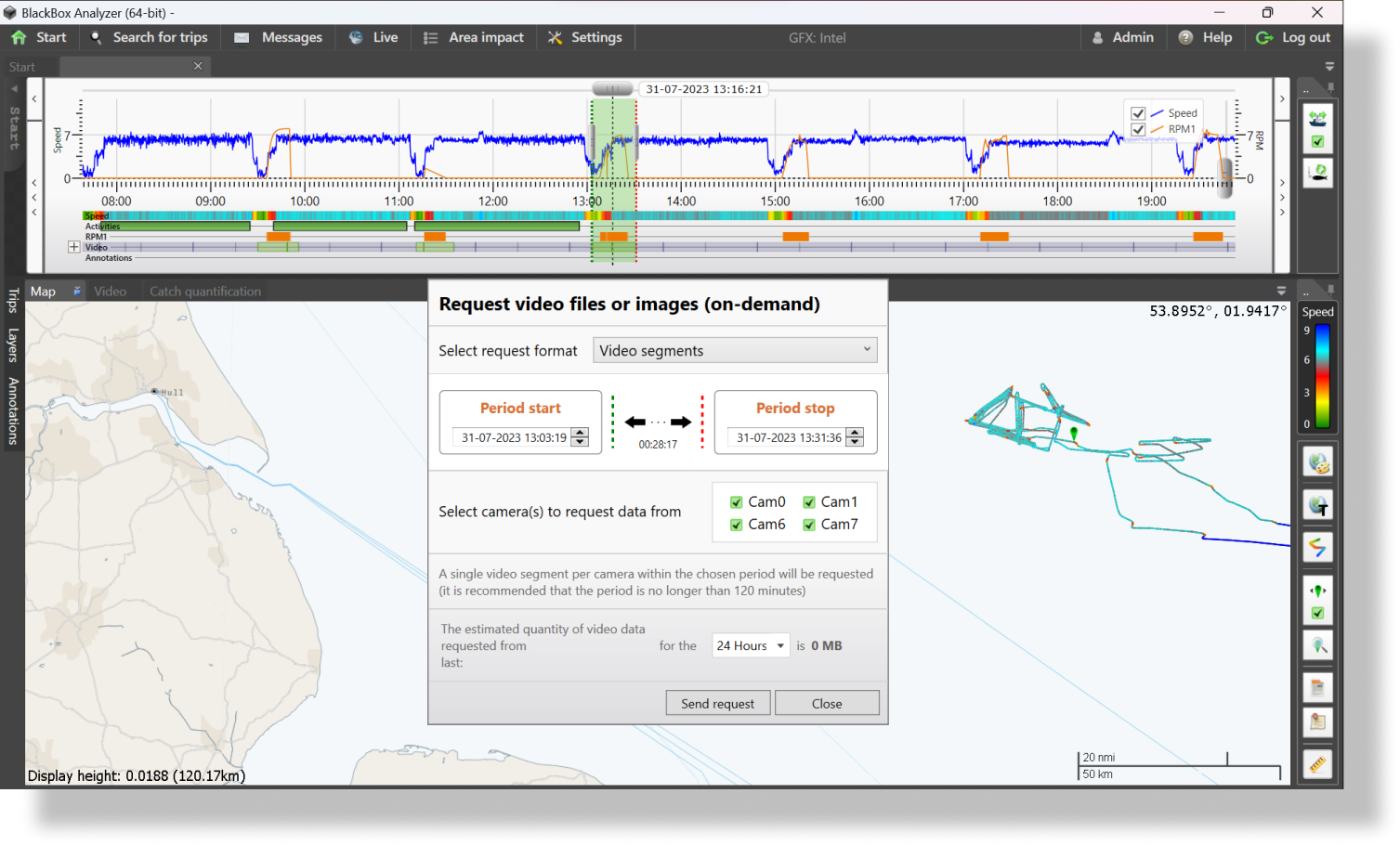 The search for trips feature enables a user to search for fishing trips based on various criteria, including by vessel and/or vessel group, date period or date range and/or by specific area(s). Multiple trips from multiple vessels can be analysed at once via the built-in data visualisation and video playback features.
